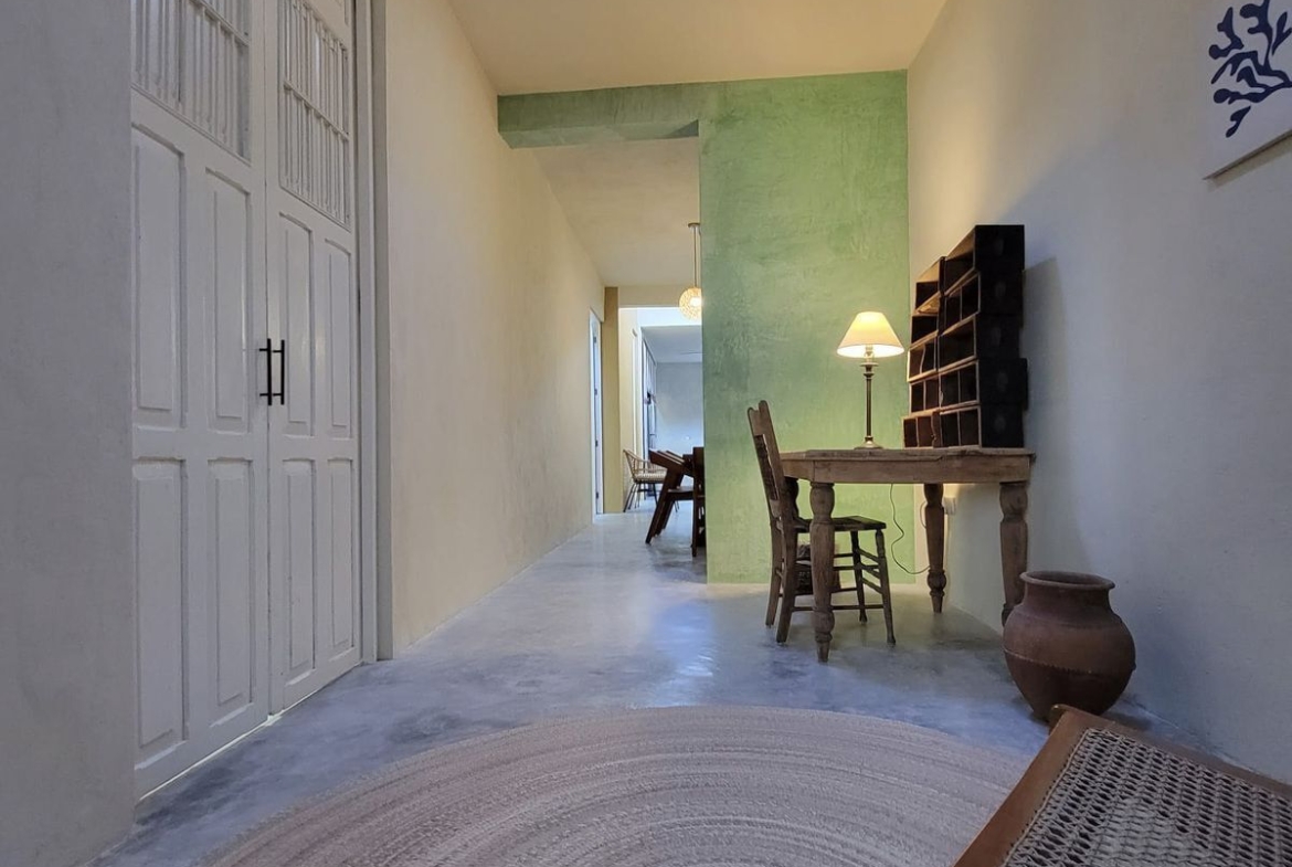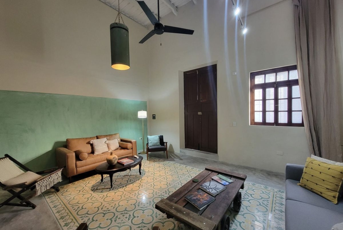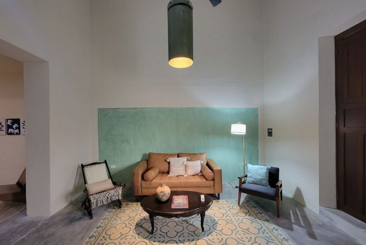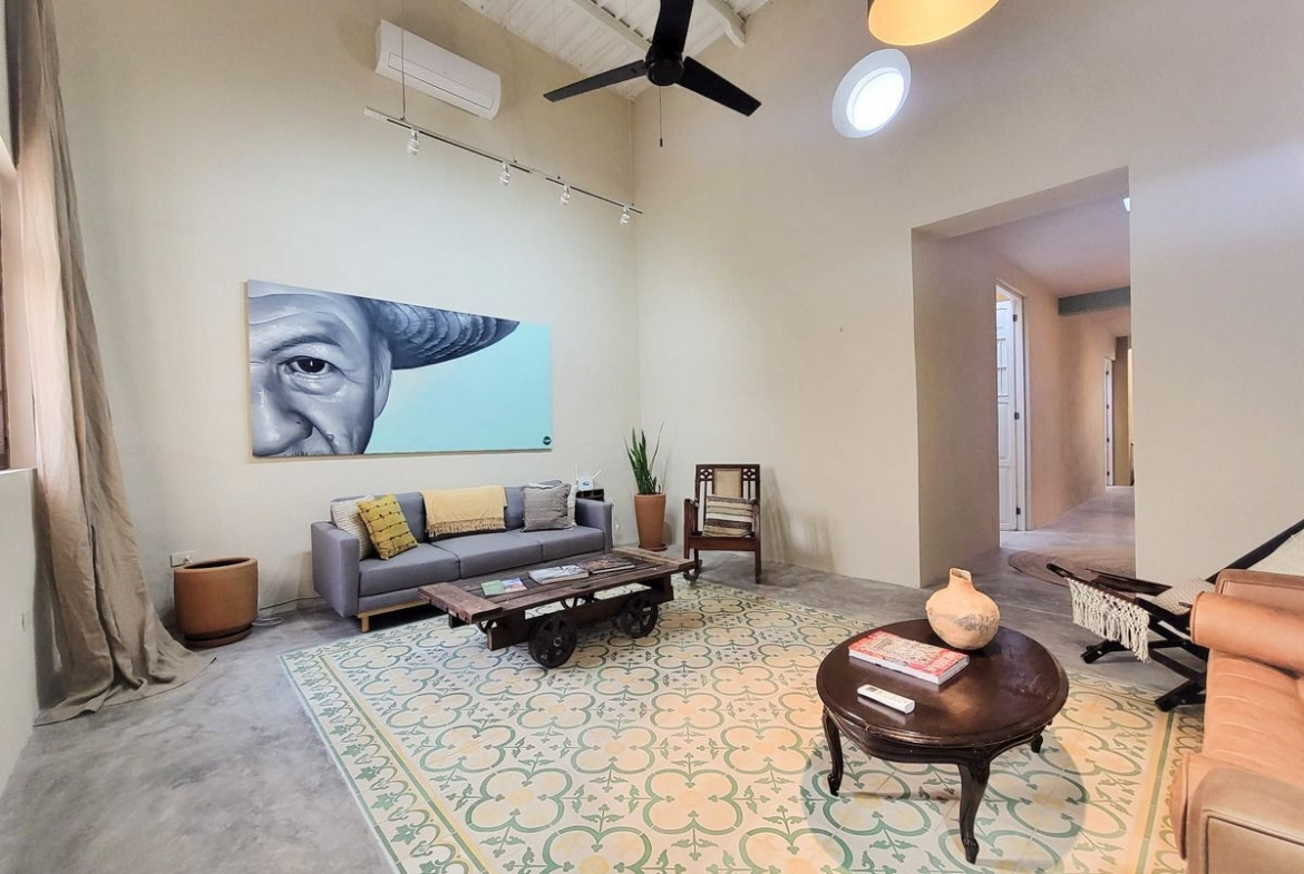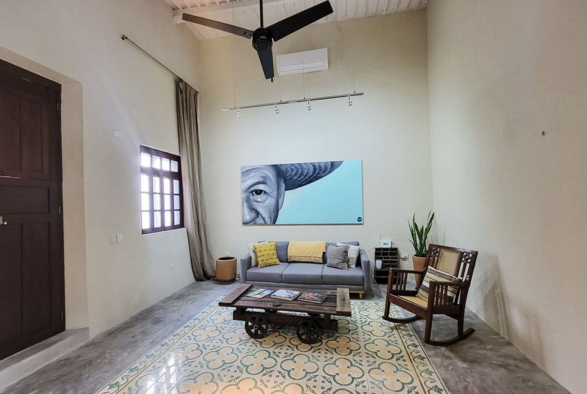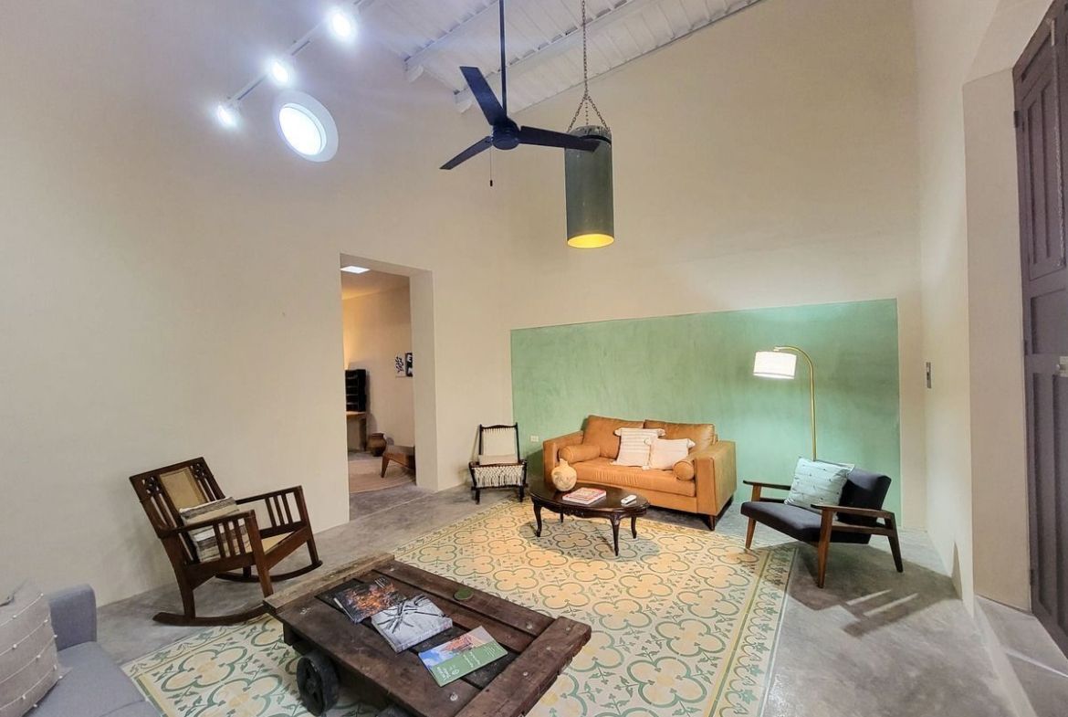 The bright and airy living area welcomes you with high ceilings, original pasta tile floors, and a striking piece of contemporary Yucatecan artwork that adds both charm and sophistication. The primary suite opens directly to the lush garden and pool area, offering a peaceful space to relax and unwind.