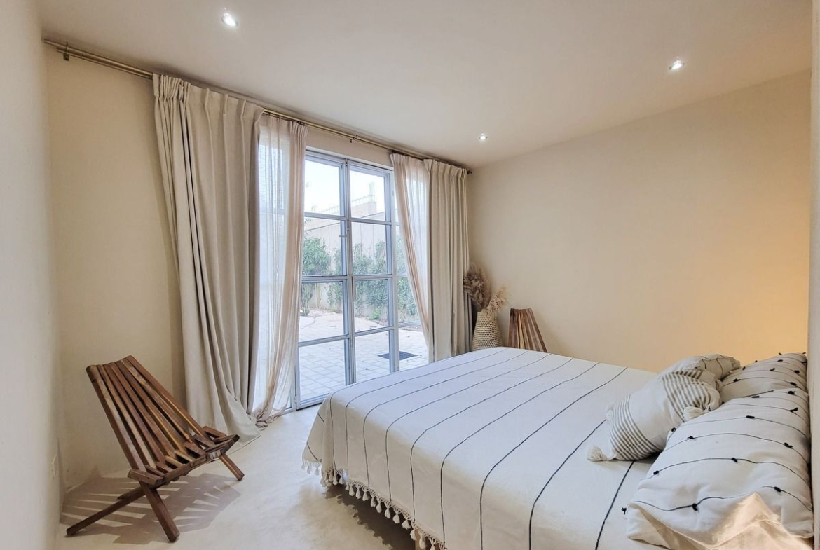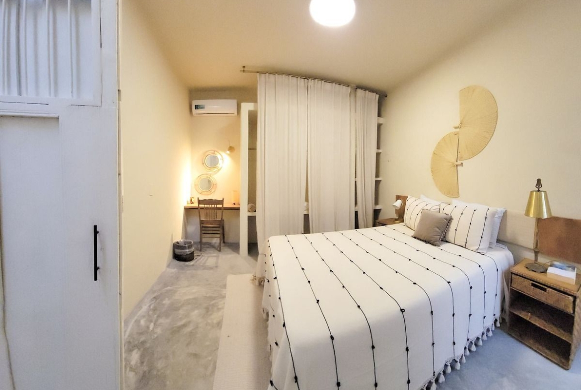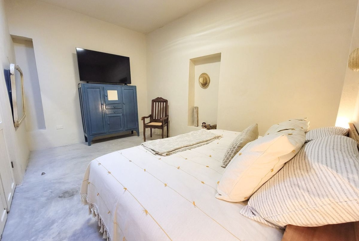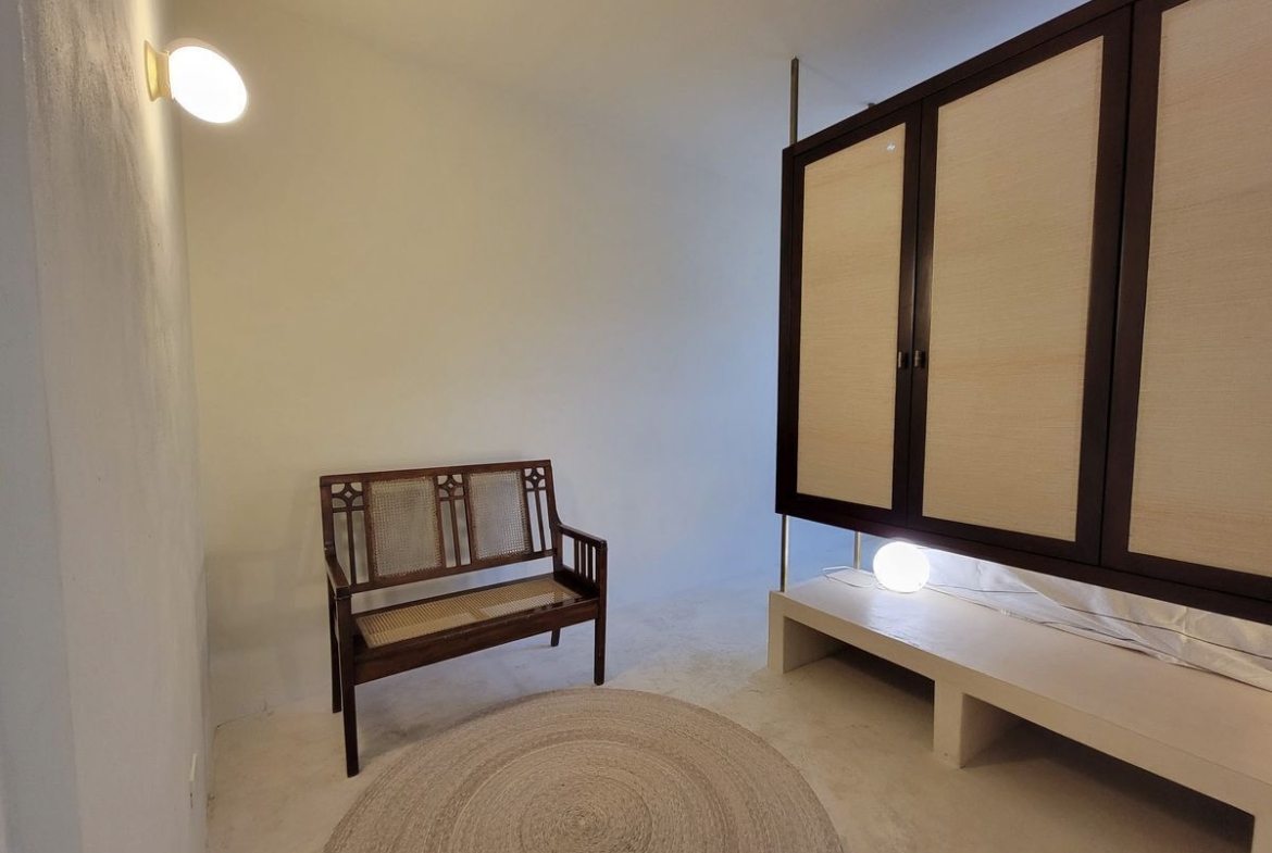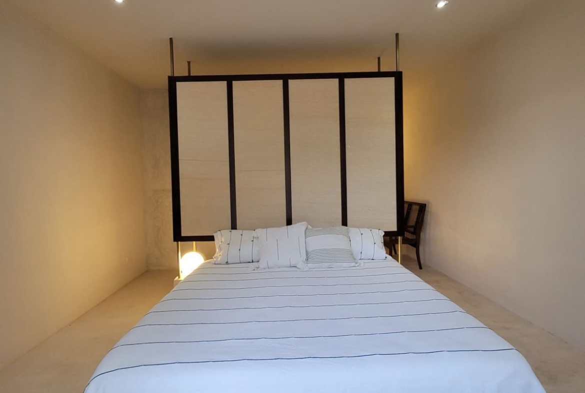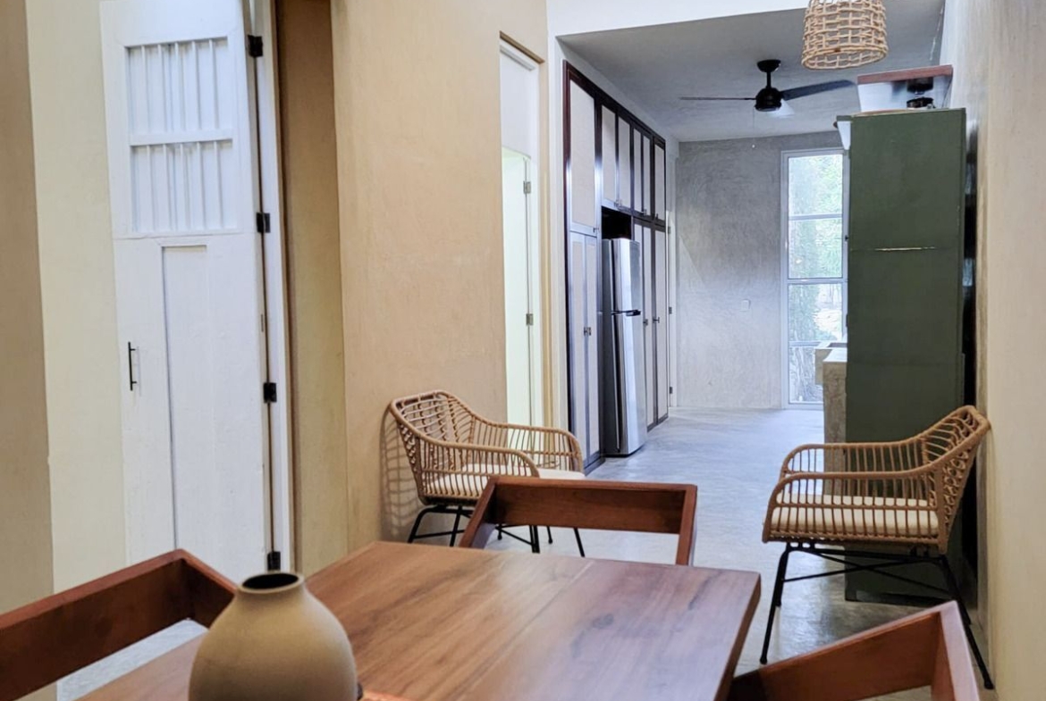 The bright and airy living area welcomes you with high ceilings, original pasta tile floors, and a striking piece of contemporary Yucatecan artwork that adds both charm and sophistication. The primary suite opens directly to the lush garden and pool area, offering a peaceful space to relax and unwind.
