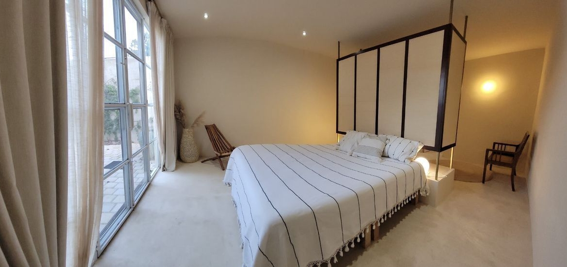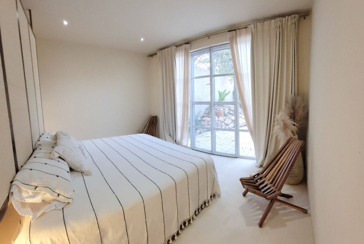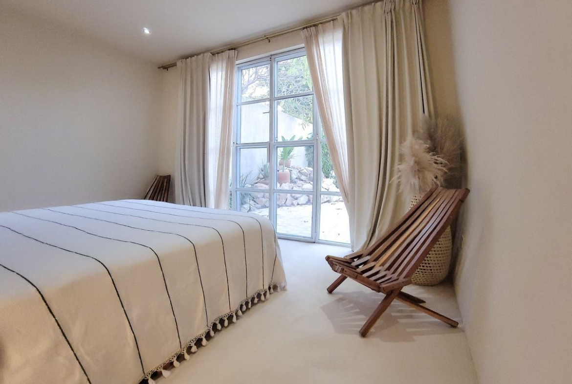 The fully equipped kitchen features sleek countertops, custom cabinetry, and open shelving. A direct connection to the garden makes it perfect for morning coffee or outdoor dining under the stars.