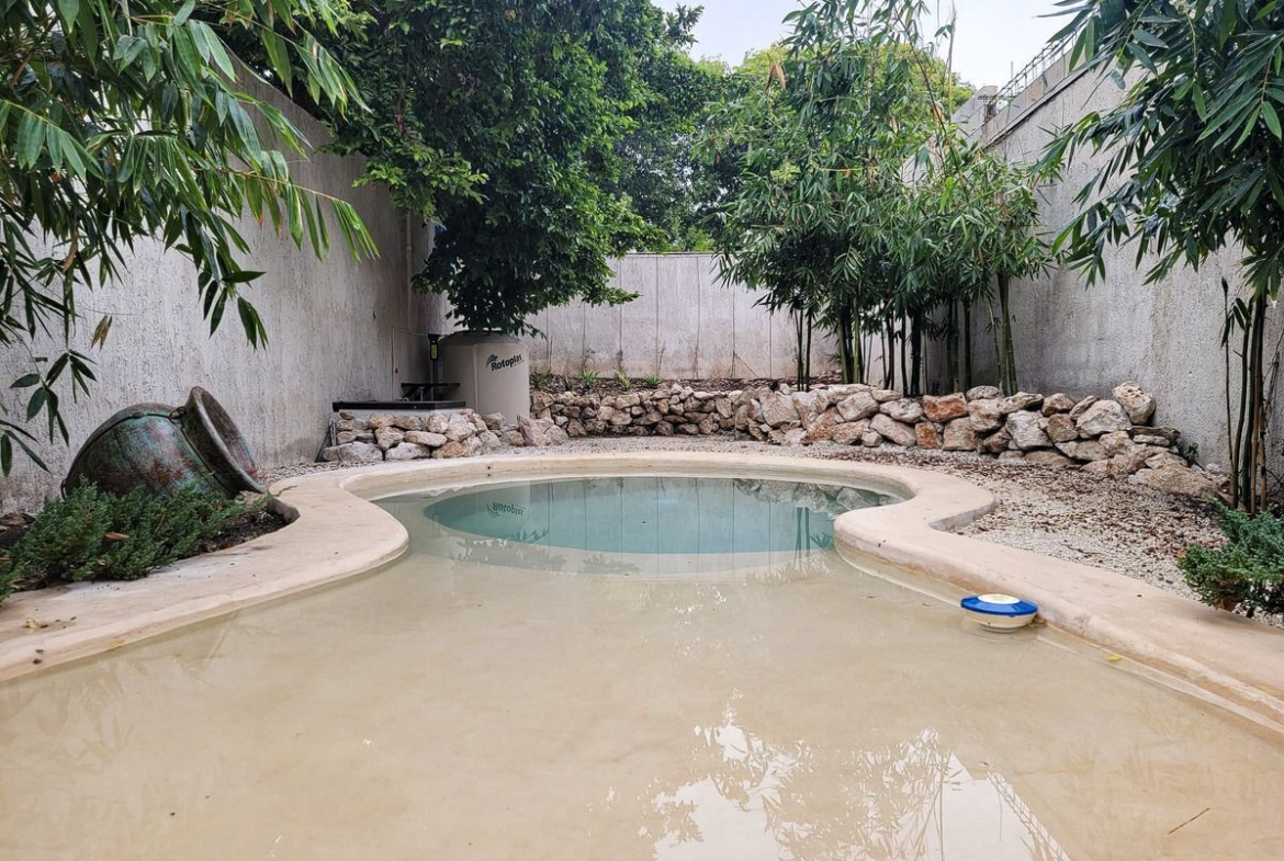 La propiedad cuenta con una sala luminosa y fresca, techos altos, pisos de pasta originales y una pieza de arte yucateco contemporáneo que aporta estilo y carácter al espacio. La recámara principal tiene acceso directo al jardín y la piscina, perfecta para despertar con vista al verde.