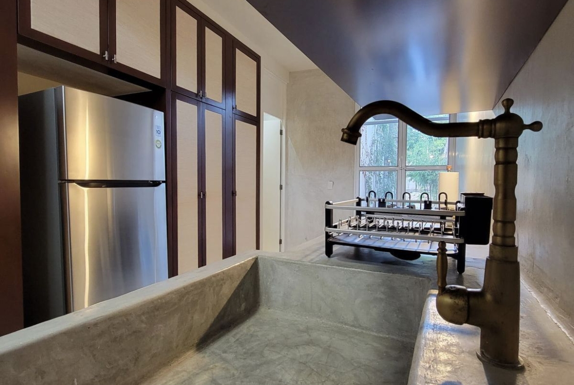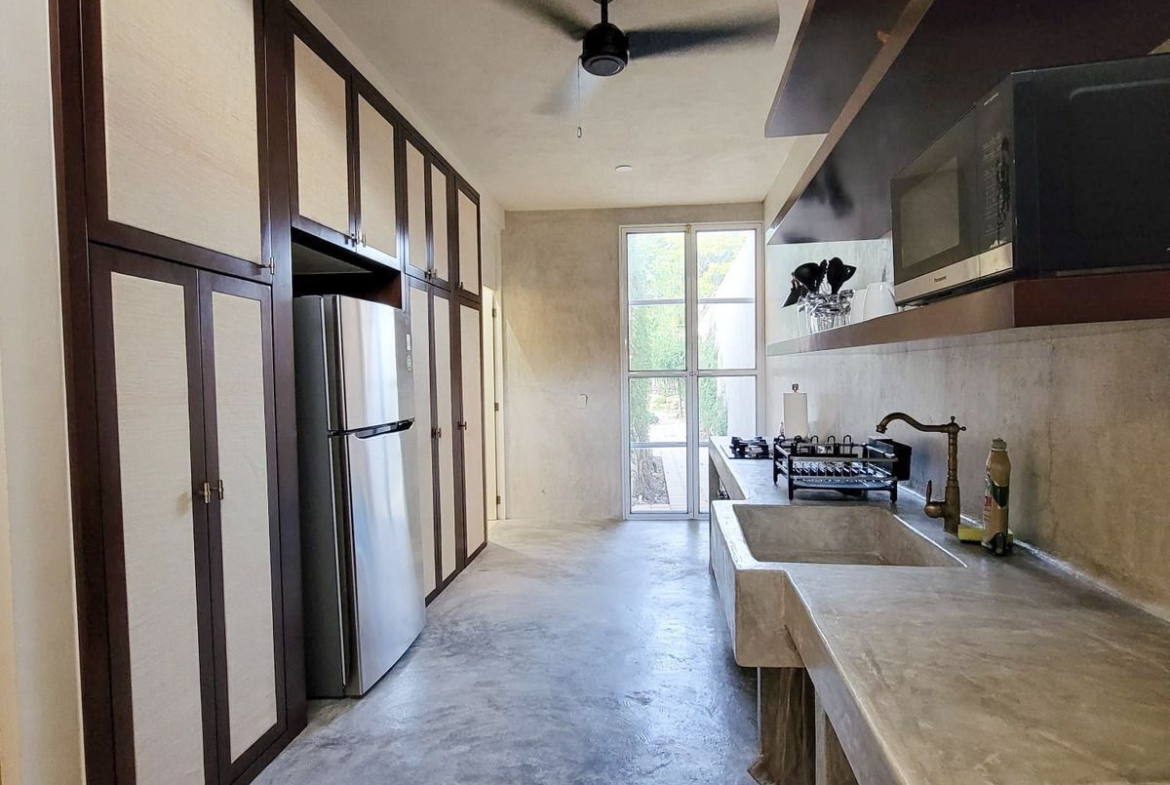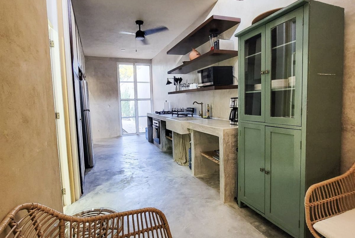 La cocina está completamente equipada con encimeras elegantes, gabinetes a medida y estantes abiertos. Además, conecta con un sendero que lleva directamente al jardín, ideal para desayunar al aire libre o recibir invitados bajo las estrellas.